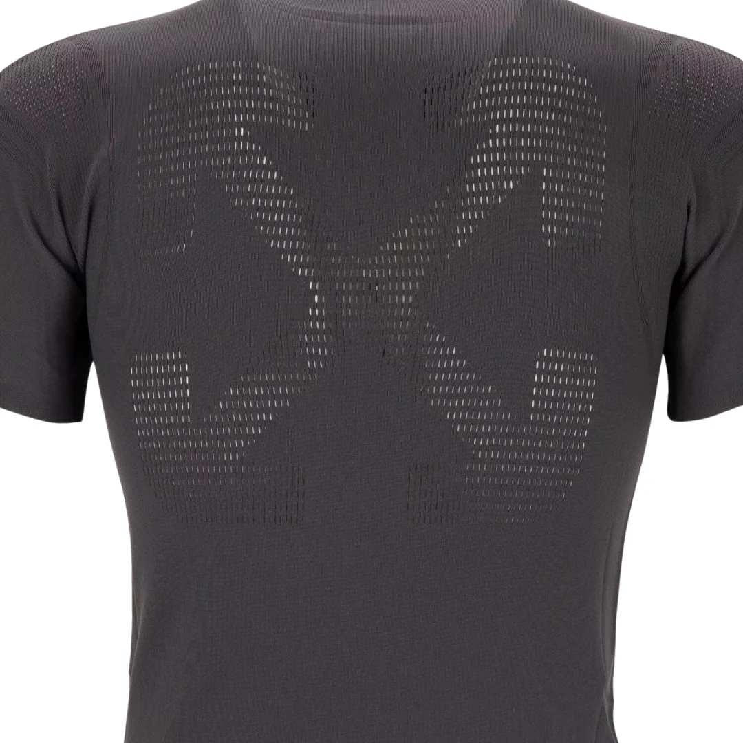 Elevate your style with the Off-White Grey Top. This iconic shirt from Off-White is not only fashionable for a workout, but it also offers a comfortable fit and premium quality. Perfect for all gym occasion, this shirt will make you stand out and feel confident., Off-White Grey Shirt, 100% Nylon, Grey Running Top, Arrow Design on Back, Active Wear, Slim Fit, Breathable Design